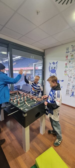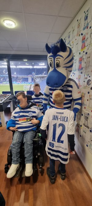 Beim Spiel unseres MSV Duisburg gegen den FC Erzgebirge Aue hatten wir Nick mit seinem Bruder Finn und ihrer Familie zu Besuch in der zebrakids-Hospizloge. Da die ganze Familie eingefleischte MSV-Fans sind, war das natürlich ein echtes Heimspiel auch für uns in der Loge.
