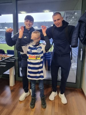 Nach dem der 3:1 - Sieg ausgelassen gefeiert wurde, besuchte noch Tribünenmoderator Piet Ahrens die Familie und tauschte sich fachkundig mit ihnen aus. Das größte Highlight waren aber dann der Besuch von Maxb Braune, Simon Symalla und Joshua Bitter in der Hospizloge: Nach unzähligen Fotos, Autogrammen und vielen Fragen machte sich eine sichtlich glückliche Familie auf den Heimweg.