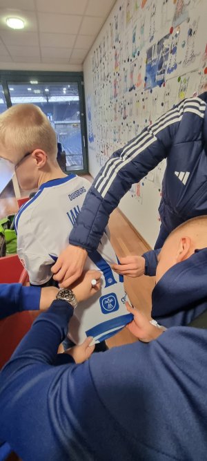 Als krönender Abschluss besuchten uns noch zwei Spieler in der Loge: unser Max Braune und die Jan-Simon Symalla. Sie nahmen sich Zeit, schrieben Autogramme, machten Fotos – und schenkten den Kindern damit einen perfekten Ausklang dieses besonderen Tages.