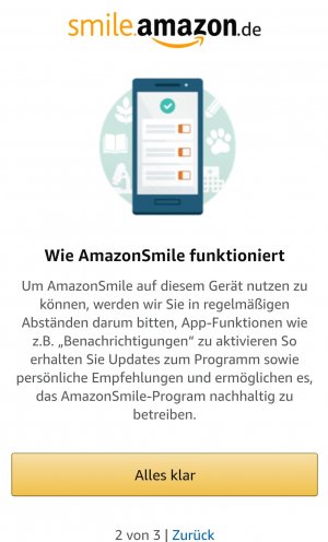 Jetzt noch eine kurze Erläuterung wie Amazon Smile genau funktioniert. Mit dem Klick auf "Alles klar" kommst Du zum nächsten Fenster.