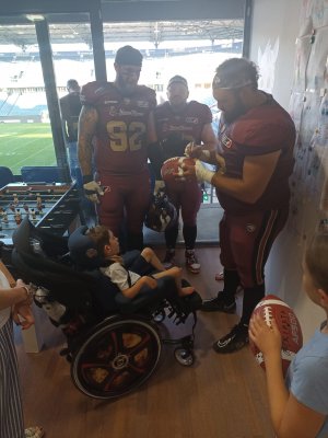 Zum Schluss gab es für beide Jungs noch einen eigenen Football, die beide beim Abklatschen am Spielfeld vom Großteil der Spieler signiert wurden. Das größte Highlight war dann aber der Besuch von Patrick Poetsch und Marvin Pludra in unserer Hospizloge, wo unzählige Fotos gemacht wurden, natürlich Autogramme gegeben wurden und alle Fragen ausführlich beantwortet wurden.
